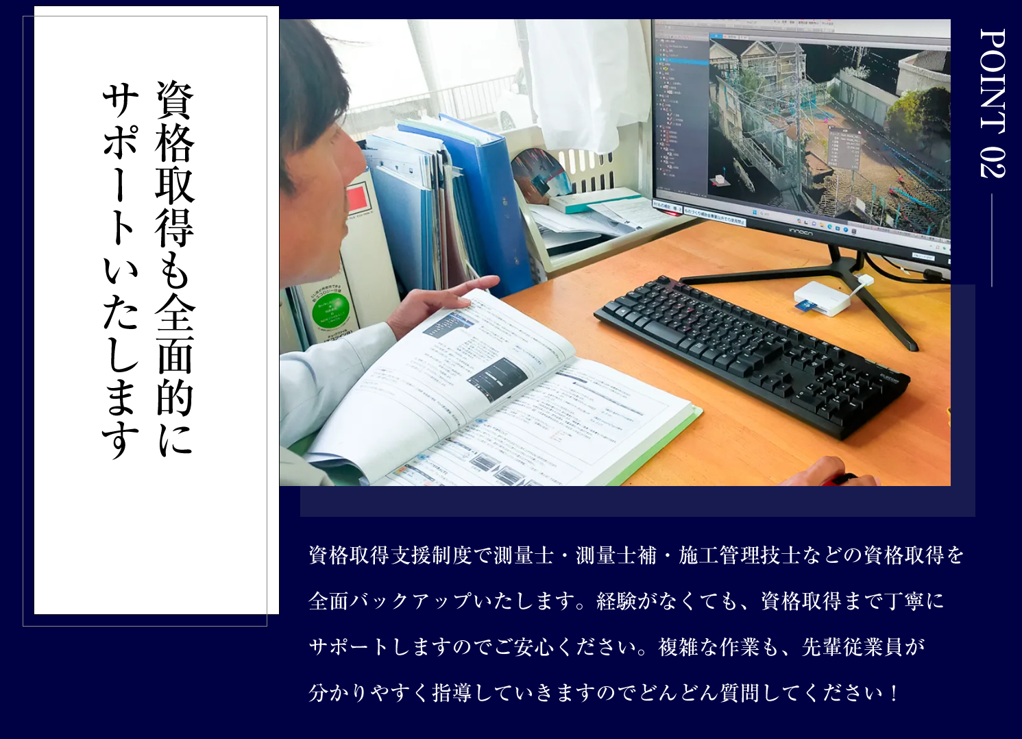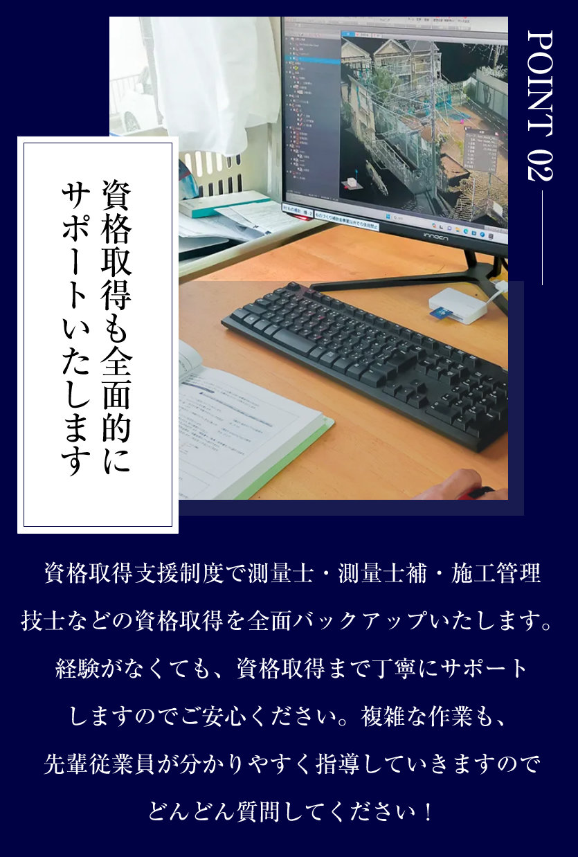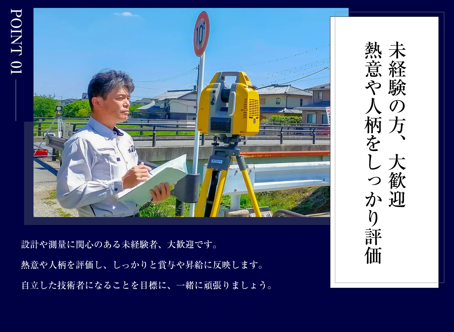 未経験者の方は、先輩について図面の見方や測量機器やCADの使い方を覚えて頂き、測量や設計の補助業務をお願いします。